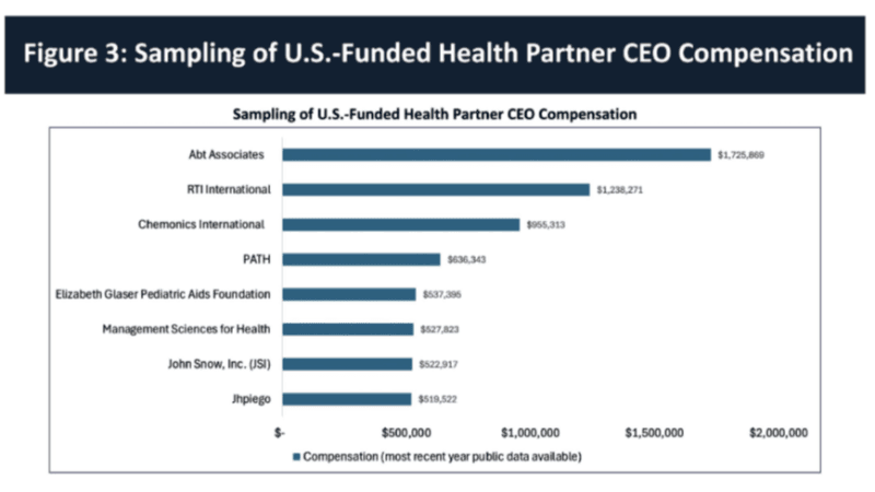 A graphic from the Strategy, showing CEO salaries from some of the major agencies that have managed US health aid for the past couple of decades, gives an idea of the problem that the US administration must address. There is simply no justification for individuals to receive multiples of the US President’s salary to distribute US aid to poor people. It is not just CEOs. Other senior executives in US-funded NGOs and foundations can also take home several hundred thousand per year, and whole new campuses have been built in Geneva, one of the most expensive cities on earth, to house their staff.