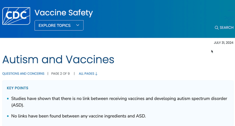 The CDC cites a series of authoritative reviews — including the 1991 and 2012 Institute of Medicine’s assessments, and the Agency for Healthcare Research and Quality’s review in 2021 — all concluding that the evidence was “inadequate to accept or reject” a causal relationship between early-life vaccines and autism.