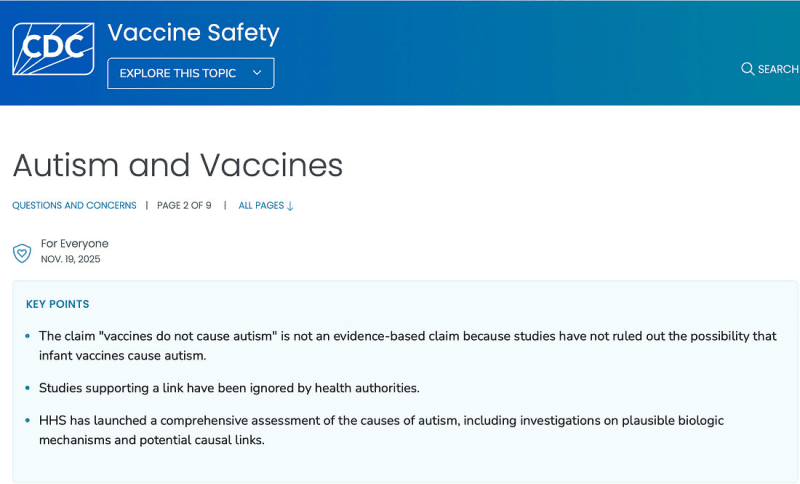 In a website update published on 19 November 2025, the agency now states that the long-standing claim “vaccines do not cause autism” is “not an evidence-based claim” because scientific studies “have not ruled out the possibility that infant vaccines cause autism.”