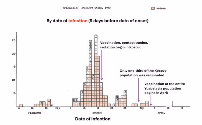 Of course, no randomized trial of that vaccine was ever conducted. There was, however, a natural experiment in Yugoslavia in 1972—a short-lived outbreak of smallpox with a total of 175 infected people and 35 deaths. Besides a vaccination campaign, there are interesting parallels to the Covid story, so it is worthwhile to re-examine that outbreak.