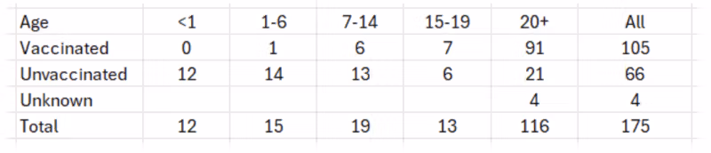 Reading the report, there is little doubt that the authors connect the infection to non-vaccination. This, however, is a case-only study. There are no controls. To estimate the odds ratio, a measure of association between vaccination status and infection status, we need the same kind of data on controls, or simply data from the respective population. For instance, the odds of having been vaccinated in cases age 20+ were 91:21. What were the odds of having been vaccinated in that age group? If previous vaccination was effective, the latter odds should have been higher (odds ratio < 1).