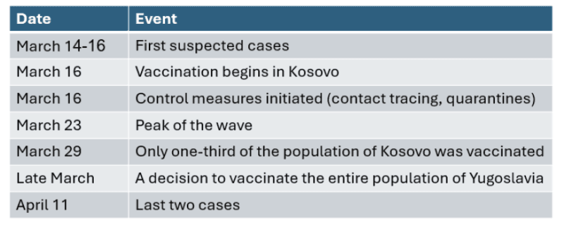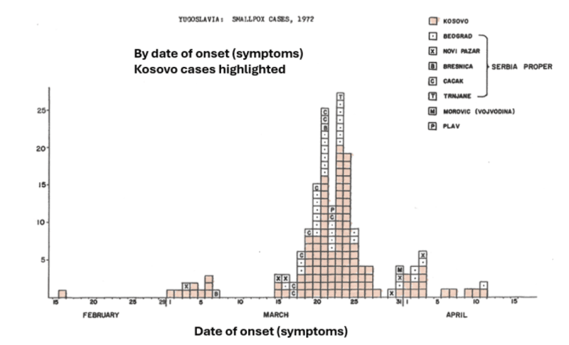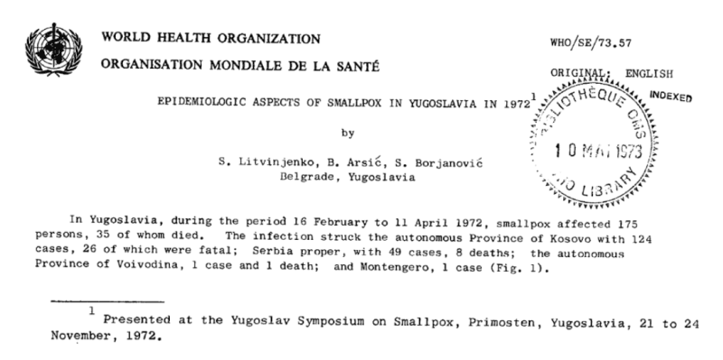 My primary sources were a document published by the WHO in November 1972 and a paper published 50 years later. Another recent paper also provided a historical review of the population of Kosovo, where almost three-quarters of the cases have occurred. As expected, all three papers and others attribute the end of the smallpox outbreak in Yugoslavia to the public health response, which included contact tracing, quarantines, lockdowns, and mass vaccination. Was that indeed the case?