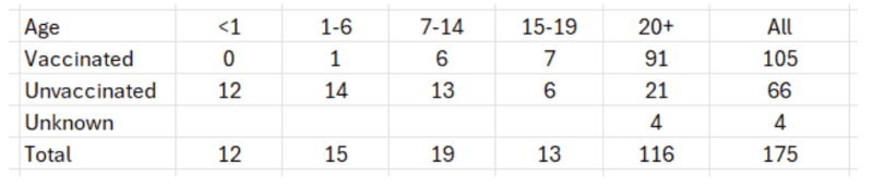 “All cases among those less than one year of age were among the unvaccinated [12 infants]. In the age-group 1-6, the age-group in which most children should be protected by primary vaccination, only one of the 15 patients had been vaccinated.”