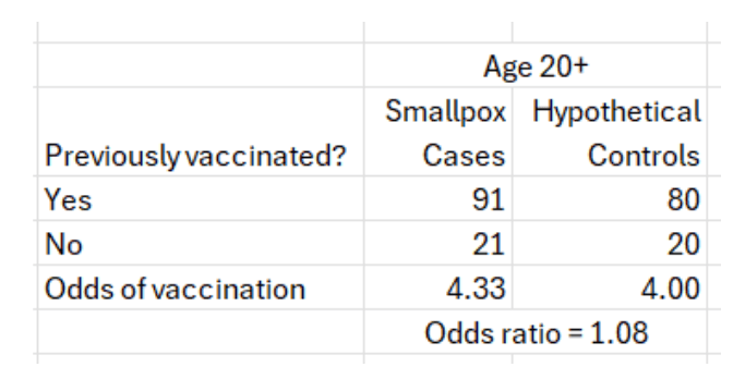 I am wondering why epidemiologists at the WHO or in Yugoslavia failed to obtain the crucial vaccination data on controls from each age group. The case-control design was relatively new in the 1970s, but epidemiologists were familiar with the famous case-control studies of smoking and lung cancer two decades earlier. Either they were confident about the effectiveness of the smallpox vaccine, or they suspected that the computation might produce disturbing results.