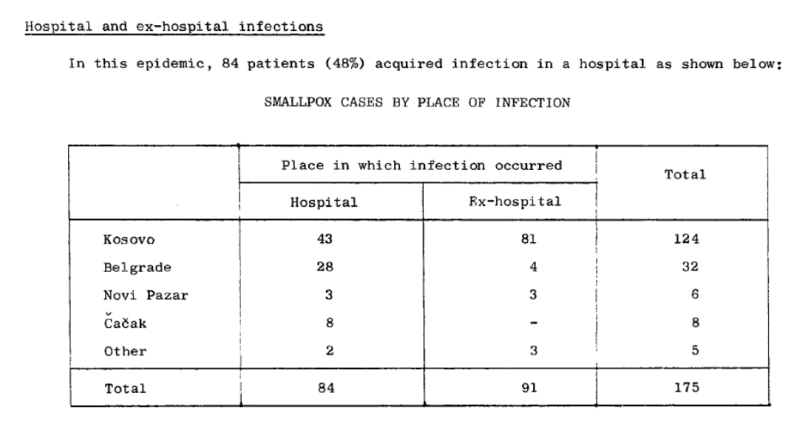 The population of Yugoslavia was far from being protected by previous smallpox vaccination, if at all. The most optimistic estimates of coverage were well below 50%. Moreover, we’ll see later that previous vaccination in childhood was not associated with a reduced risk of infection in the adult population. Likewise, the last case of smallpox was reported 40 years earlier.