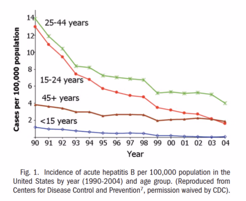 Why? Increased reluctance to share needles, needle exchange programs, safer sexual practices, more gloves worn for minor medical procedures, and probably also well targeted vaccination at those high-risk groups. The people who said the decline was primarily due to infant vaccination could not have been experts, because they do not apparently understand these concepts and data that the average American will immediately comprehend.