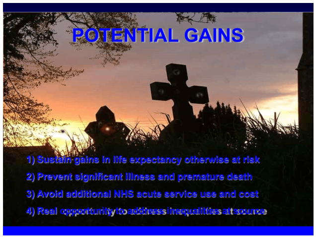 The predicament was that the National Health Service already offered universal health checks for people between 40 and 74 years of age who were tested for cardiovascular disease, diabetes, and chronic kidney disease. A slide show claimed that annual health checks would prevent at least 9,500 heart attacks and strokes, 2,000 deaths and 4,000 people from developing diabetes. A slide with a graveyard ensured that no one would miss what would happen if they didn’t attend health checks: