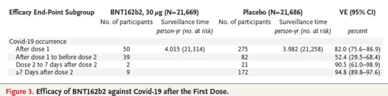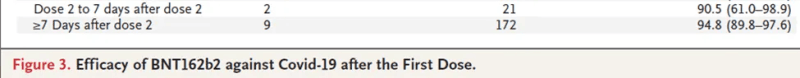 The last row shows that the seventh day was included in the computation of 95% effectiveness (≥7), so the previous row should read: “Dose 2 to 6 days after dose 2.” That’s a total of seven days, including the day of the injection.