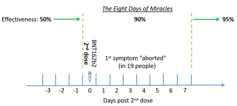 I will focus first on a narrow window — eight days in the follow-up time — shortly after the second dose. I call that period The Eight Days of Miracles because what happened at that time was miraculous. Vaccine effectiveness has dramatically increased in the blink of an eye: from 50% to 90%. Too good to be true?