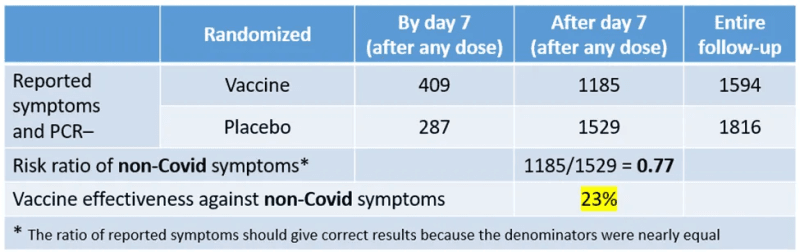 But the disturbing result shows up outside the reactogenicity window. In most of the follow-up time, vaccine recipients were less likely to report non-Covid symptoms (risk ratio of 0.77). Why? Why do participants in the two arms of a well-balanced trial report non-Covid, yet Covid-like, symptoms at a different rate? Does the Pfizer vaccine protect against symptoms that are not caused by the virus (“vaccine effectiveness” of 23%)? Another miracle?