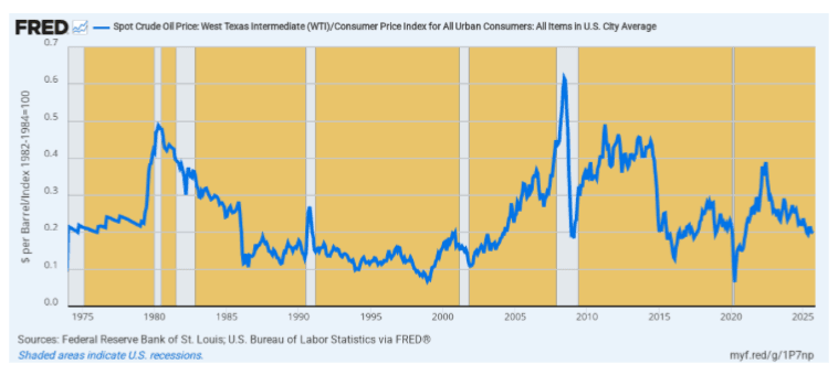 Suffice it to say here that the correct answer to high oil prices everywhere and always is high oil prices. This truth was driven home in spades by the oil busts of 2009, 2015, and 2020, and the fact the real price of oil today (2025 $) is no higher than it was in the mid-1970s.