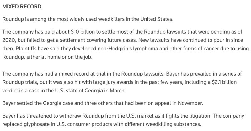 - Assertions by Bayer that it was developing 5 newer pesticides and would simply replace glyphosate with something better (and potentially more dangerous). If it kept swapping out pesticides as their harms became known, it could avoid having label warnings placed on them.