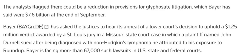- Bayer hinted it could spin off part of the company, leaving all the liability in an underfunded spinoff that would not be able to pay claims.