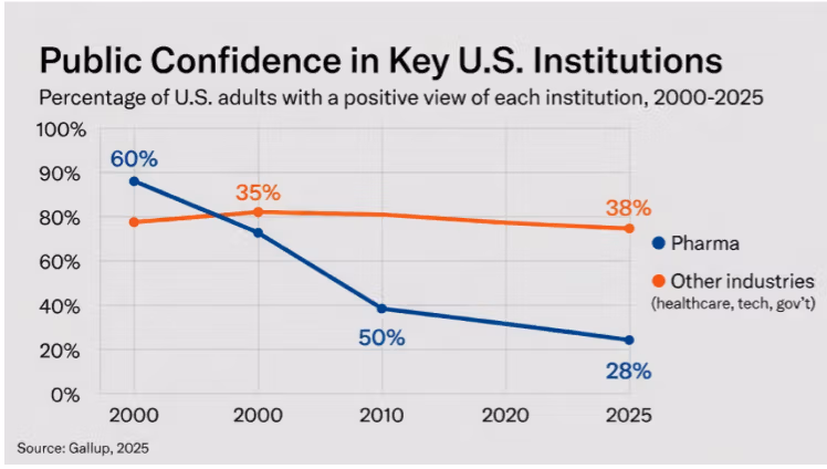 Gallup has measured confidence in industry for a quarter of a century. During this time, the status of the pharmaceutical industry has only fallen. Now it rates second-to-last of 25 industries right above government itself. In 2020, 34 percent of those polled had negative or somewhat negative views. That is now 58 percent, with only 28 percent expressing some confidence. That’s rock-bottom.