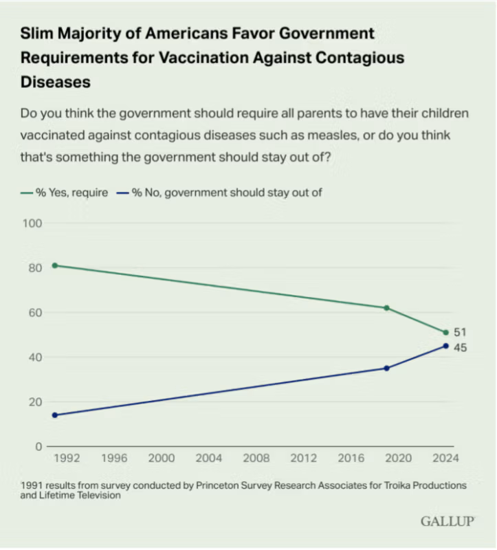 Back in 1992, the public overwhelmingly supported vaccination requirements in general: 80% for and only 17% against. Those numbers are on the verge of crossing, according to Gallup. Even with a vaguely worded question clearly biased toward positive answers, 45% now say government should stay completely out, while only 51% support vaccination requirements.