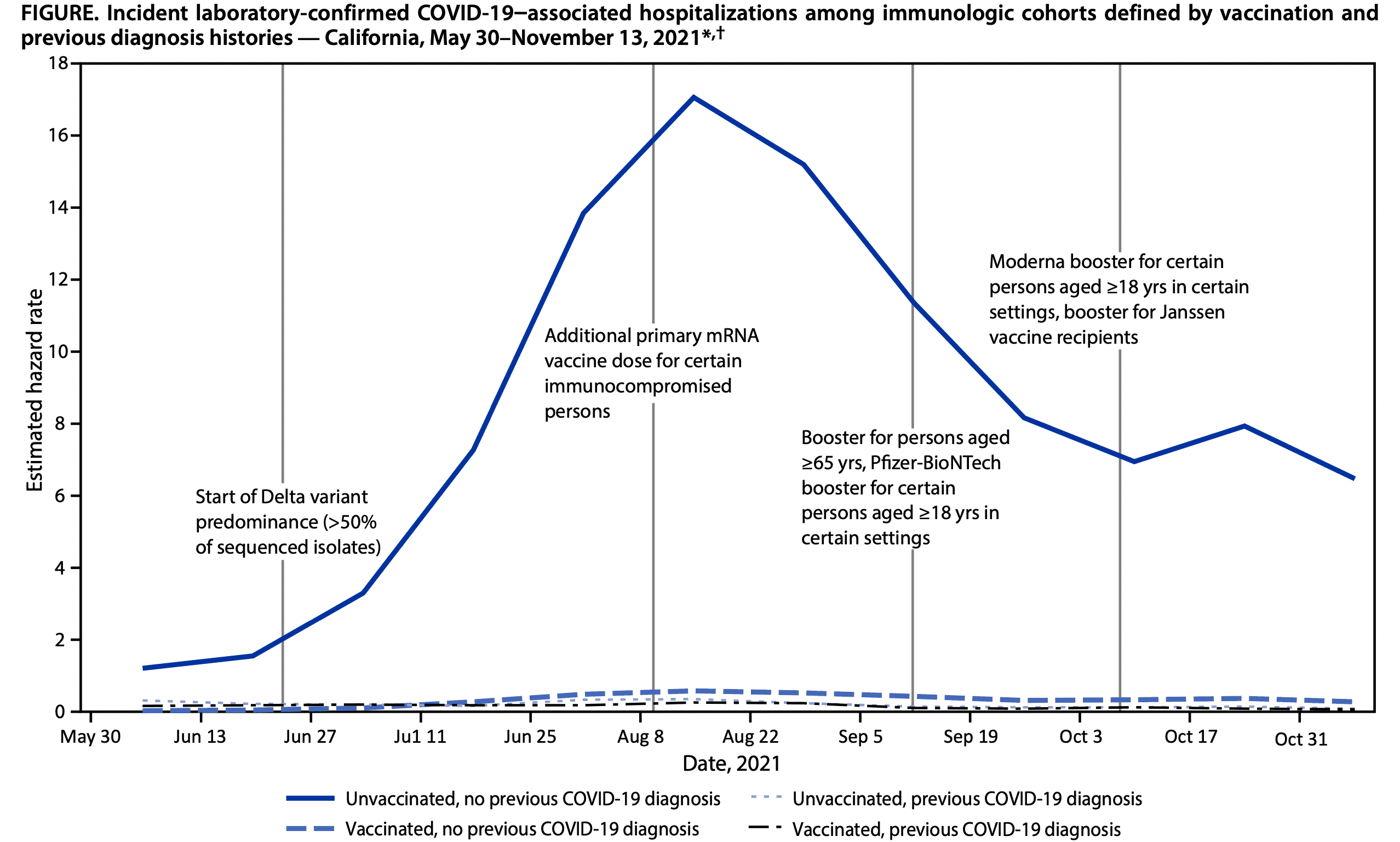 The Morbidity and Mortality Weekly Report (MMWR) published by the Centers for Disease Control has released a fascinating study on comparing hospitalization with Covid-19 immunity status, thus addressing a topic of pressing concern for public health. The study, published in the January 28, 2022 weekly, carries the self-explanatory title “COVID-19 Cases and Hospitalizations by COVID-19 Vaccination Status and Previous COVID-19 Diagnosis — California and New York, May–November 2021.”